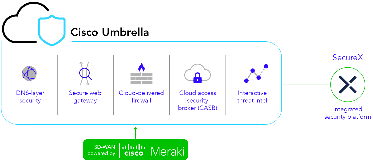 If so, we could help explore Umbrella’s leading cloud-native security. Meraki MX and Umbrella integration provides an effortless start to your Secure Access Service Edge (SASE) journey. With simplified IPSec tunnel connectivity, you’ll get fast deployment across your distributed locations. Streamlined network configuration and security enforcement make it easy to secure cloud access and protect users against internet threats on, or off, the network.