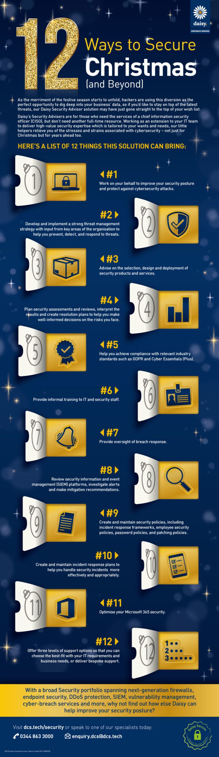 Take a look at the infographic below and discover 12 ways our Daisy Security Advisor solution can ensure you stay on top of the latest threats – not just for Christmas but for years ahead too.