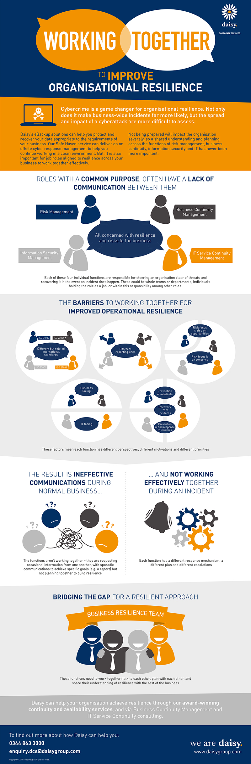 It is crucial for anyone aligned to achieving resilience across your business, to work together effectively. Not being prepared will impact the organisation severely, so a shared understanding and planning across the functions of risk management, business continuity, information security and IT has never been more important.